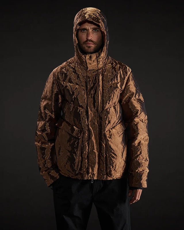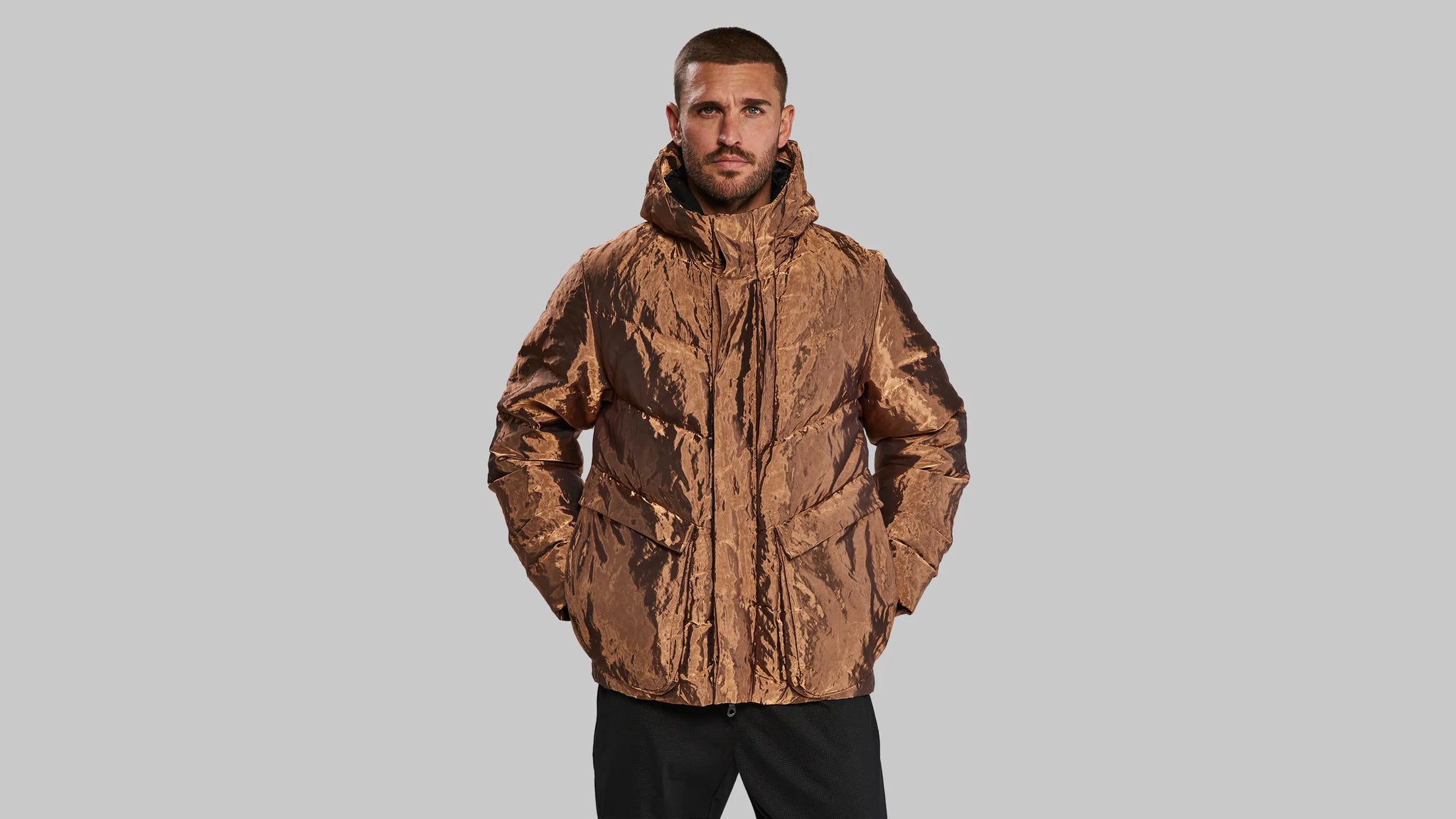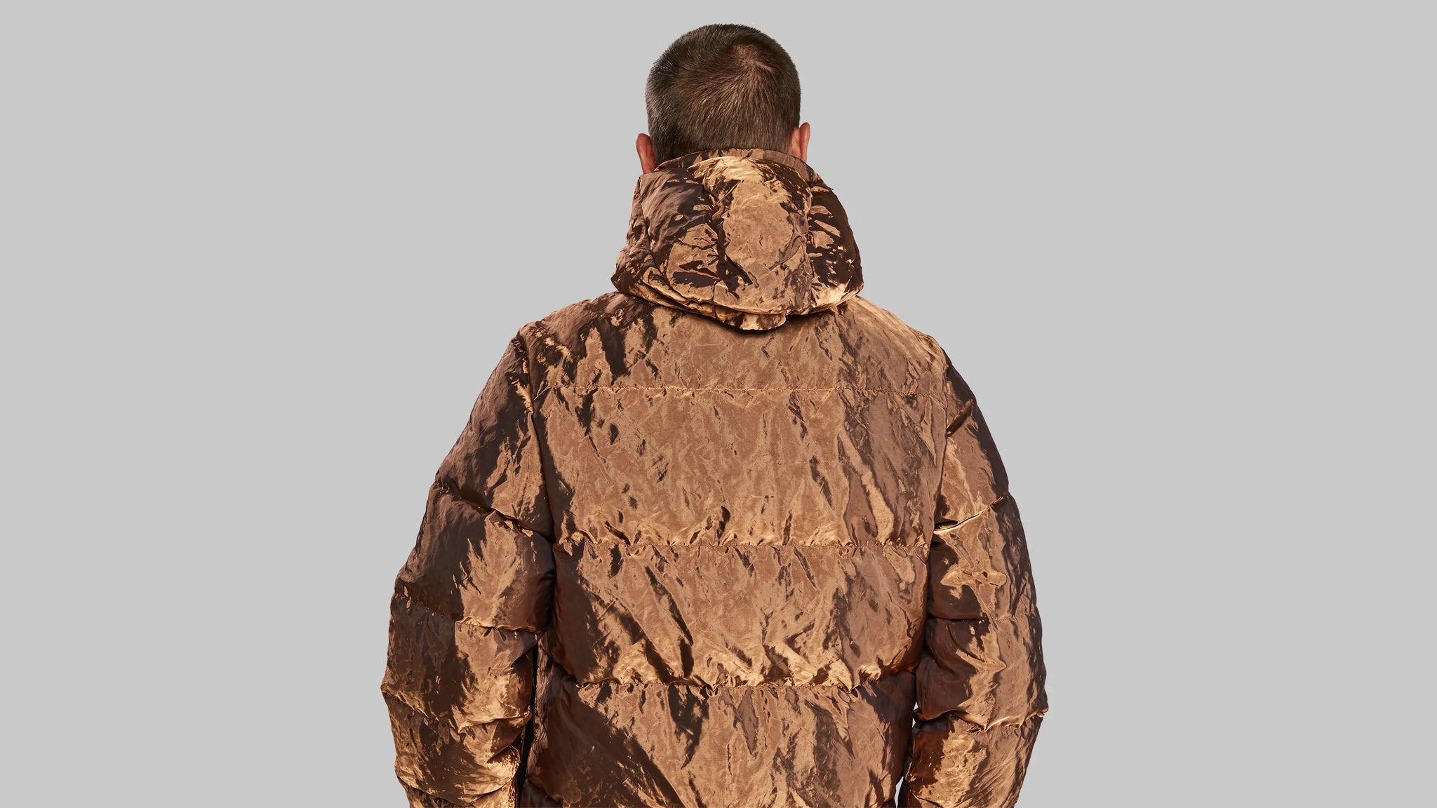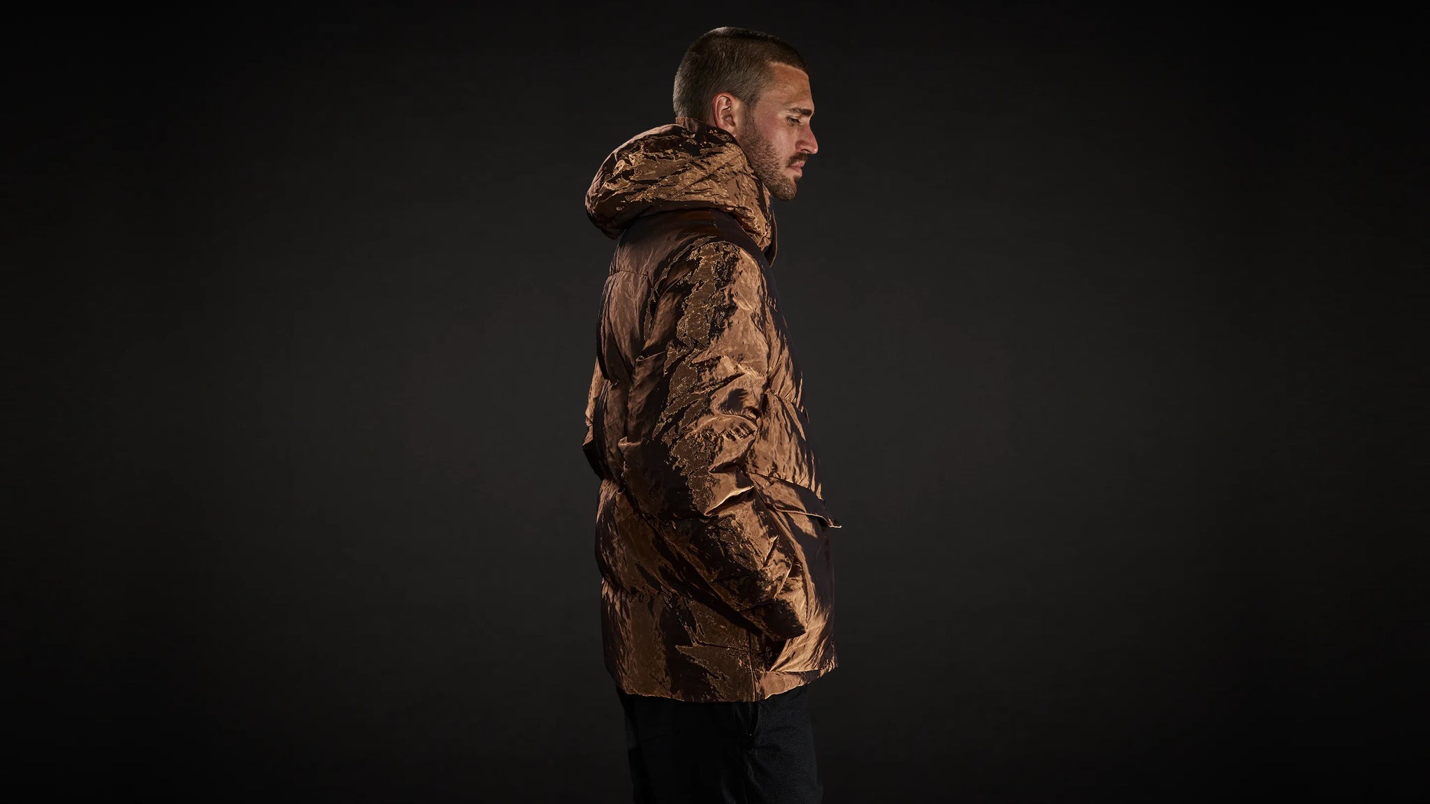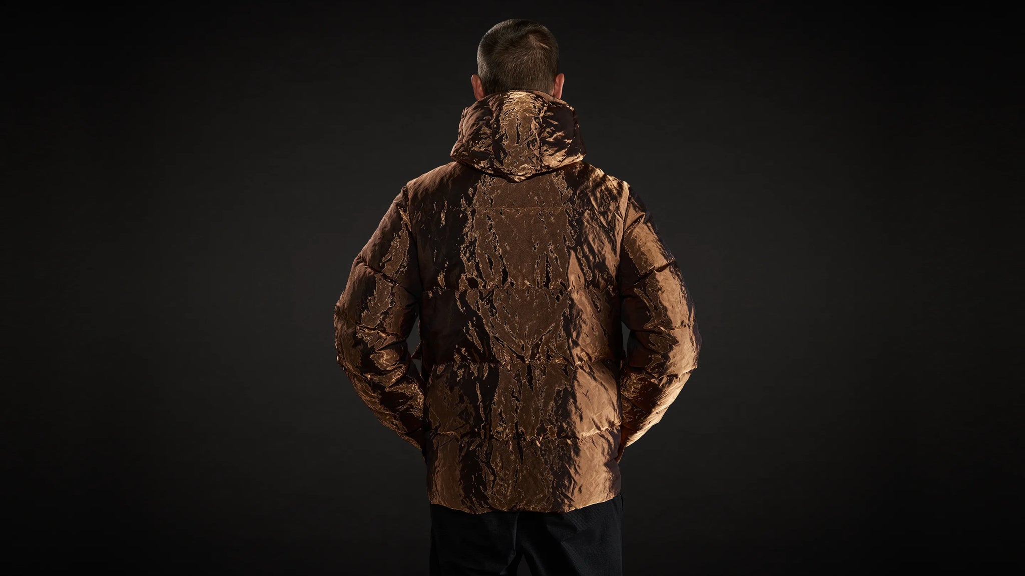 There’s a reason this is the first puffer to be built mostly from metal – and that’s because metal is designed to be strong, not malleable. But copper is different. Its atoms are arranged in something called a ‘face-centred cubic crystal structure,’ which makes it extremely strong but also malleable at the same time. And this is what allows us to create a 3 layered jacket that combines a soft inner layer, a high-performance waterproof membrane that opens and closes in the heat, and an outer layer built from lacquered copper yarn.