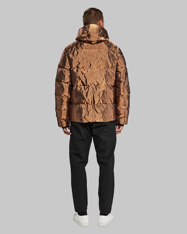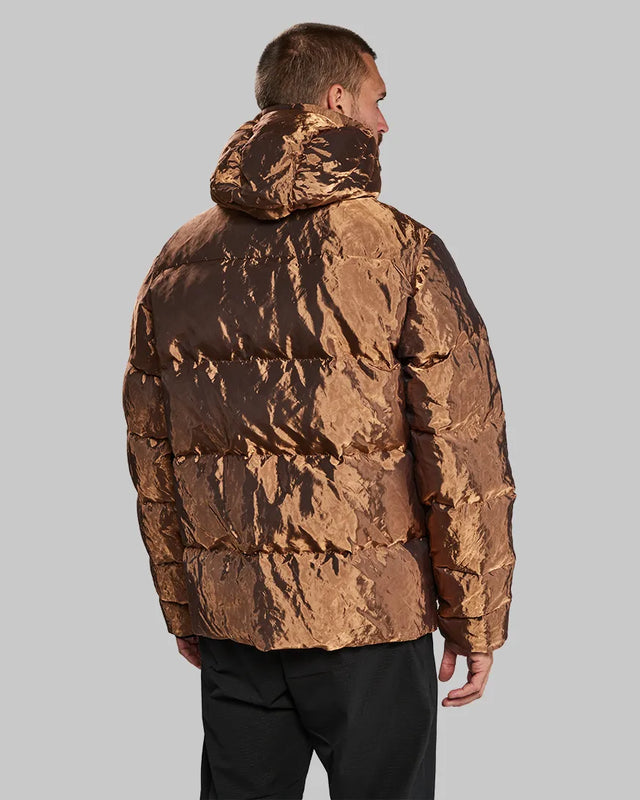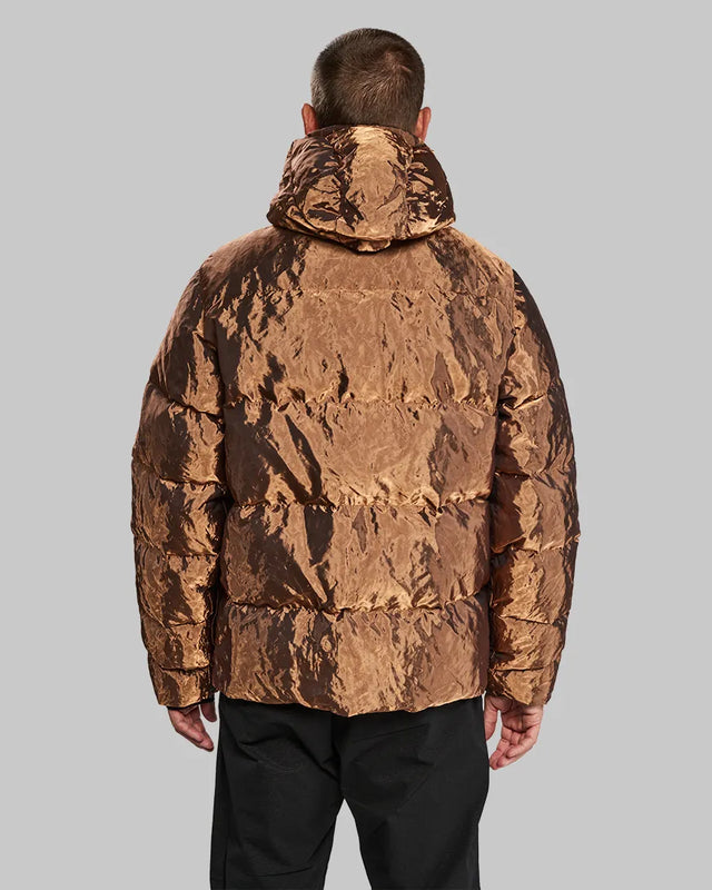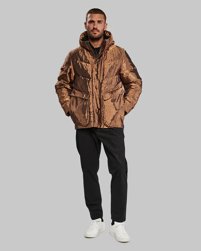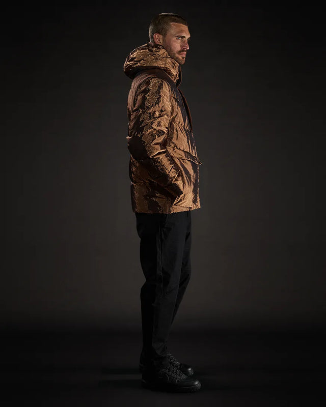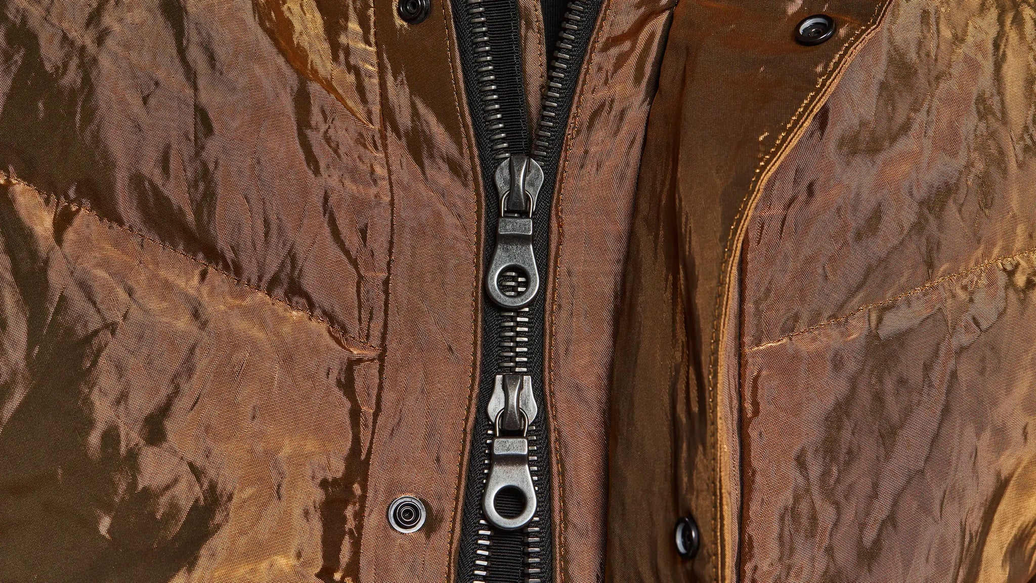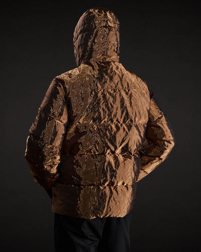 To build the Full Metal Puffer out of 60% copper, we start with electrolytic rods which we extrude like spaghetti to make strands so thin they have to be measured by lasers and can only be seen with a microscope. We then apply a series of very thin coats of lacquer to protect the copper from corrosion, cure the material for 6 days, and weave it on rapier looms before scouring, heat-setting and drying. The result is a jacket that warps and ripples in the light, and looks like CGI even when you’re standing right next to it. The Full Metal Puffer is also built with an advanced waterproof and breathable membrane that can open and close to respond to different weather conditions, while remaining permanently waterproof and windproof. And it’s packed with 100% recycled 700 fill down to keep you warm in sub-zero temperatures.