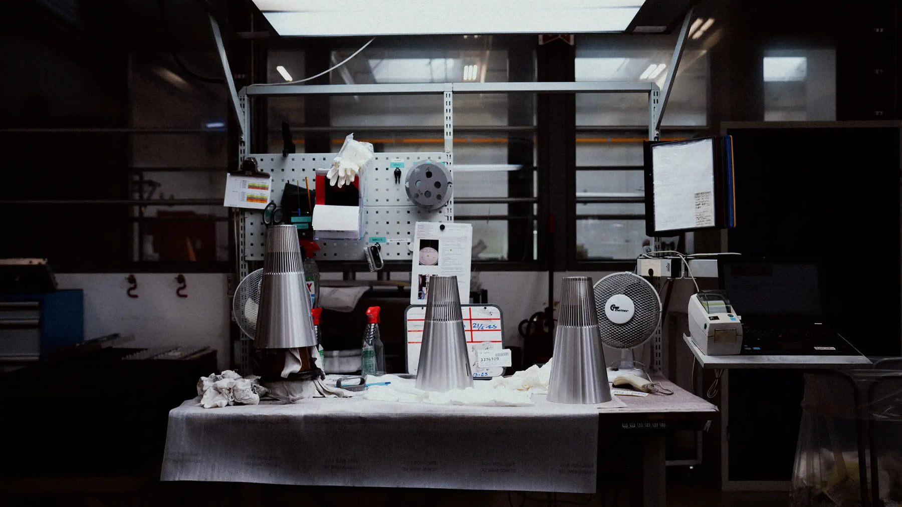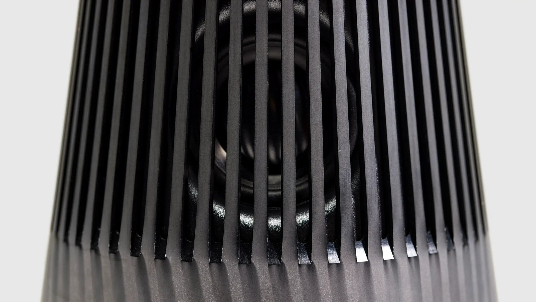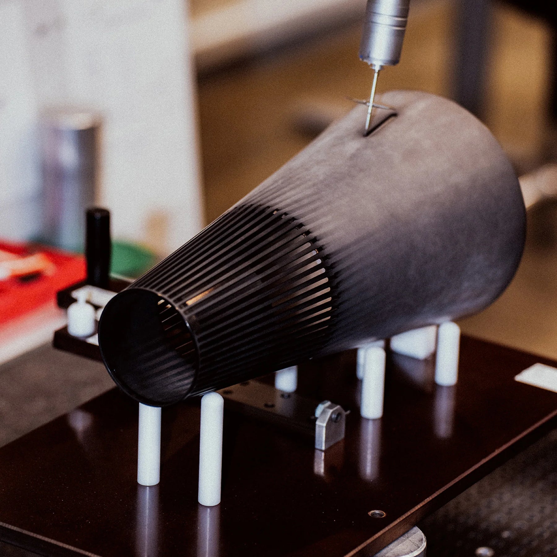 What began as an effort to replicate the effect of rocket burn led to a breakthrough in anodisation. The discovery occurred when a test piece meant to be deep black emerged with textured swirls of grey and streaks of darker pigment – what the team later dubbed the "burnout" effect. Intense experimentation followed to reproduce it under controlled conditions, yielding an unpredictable finish that gives each speaker its own unique identity.