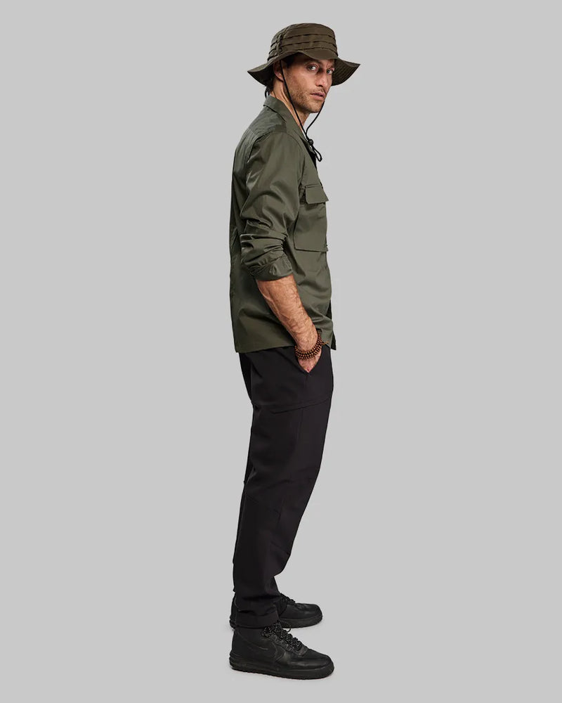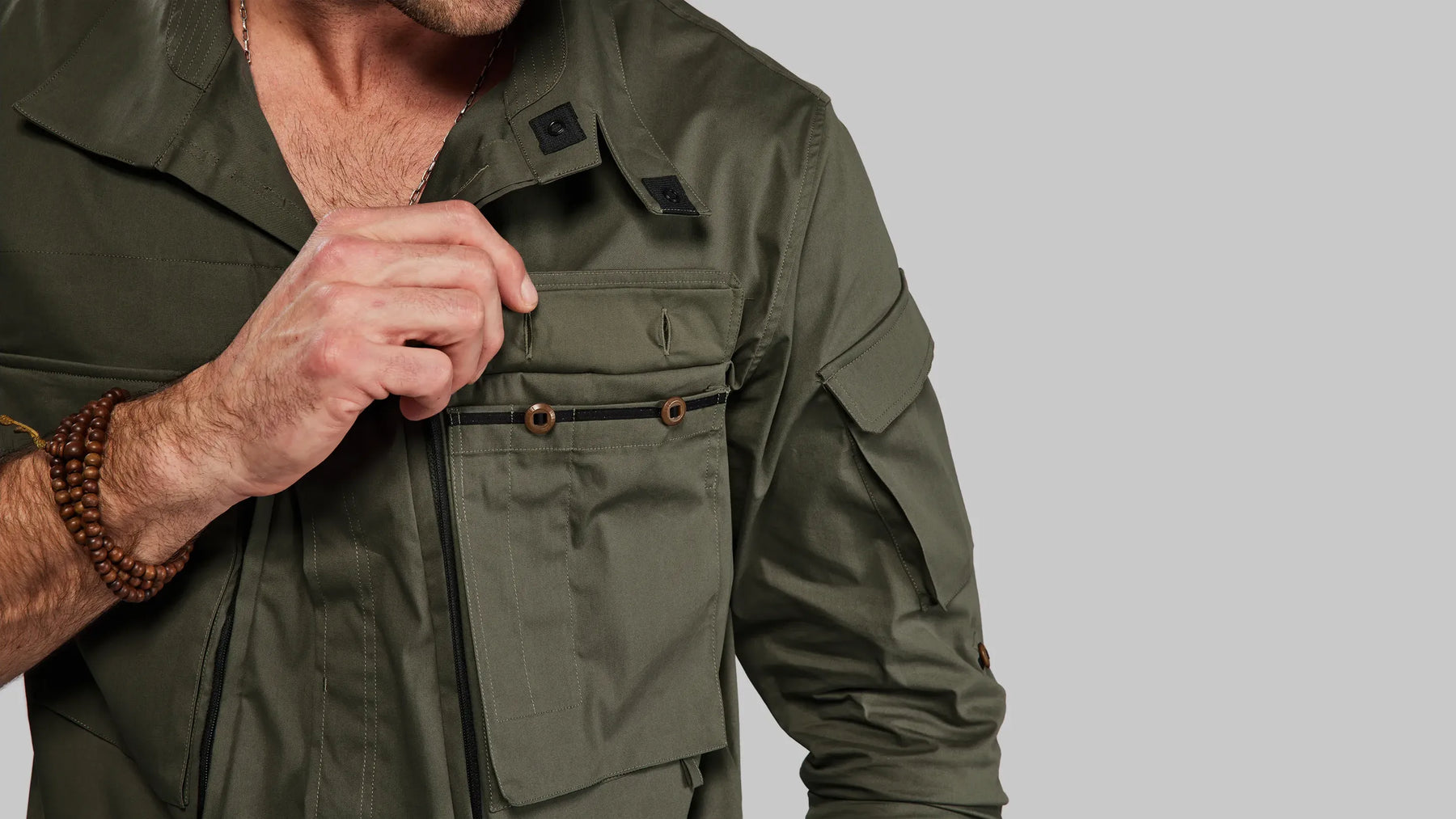 Together the pockets are designed to make your shirt more like a utility belt, so the left chest pocket is a very different beast. Instead of a hidden passport pocket you’ll find a series of 8 stitched gadget loops made from a reinforced twill tape for attaching carabiners, compasses or any clip-on gear. Two tunnels on the front of the pocket will hold mini tools, pens or penknives, depending on your plans. On the bottom of the pocket is a reinforced hanging loop for tying off. Both chest pockets fasten with two hidden slip buttons concealed on a tough woven tape.
