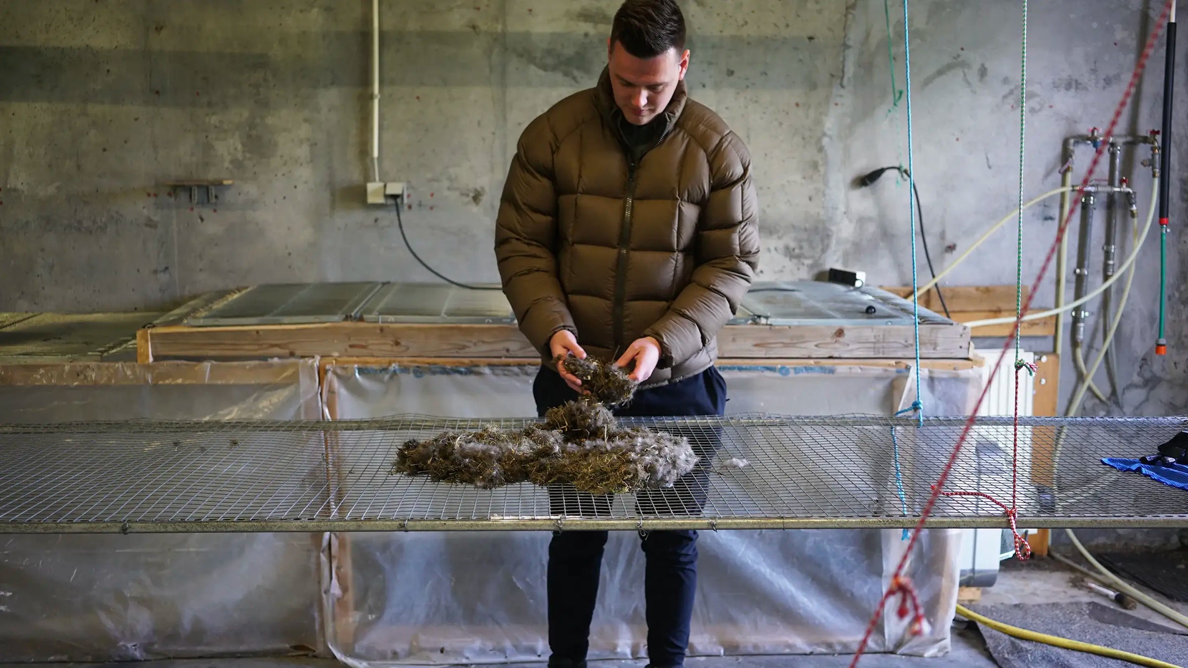 The down takes about a day to dry, hung along the racks. Then further cleaning takes place by hand. This removes about 30% of the debris.