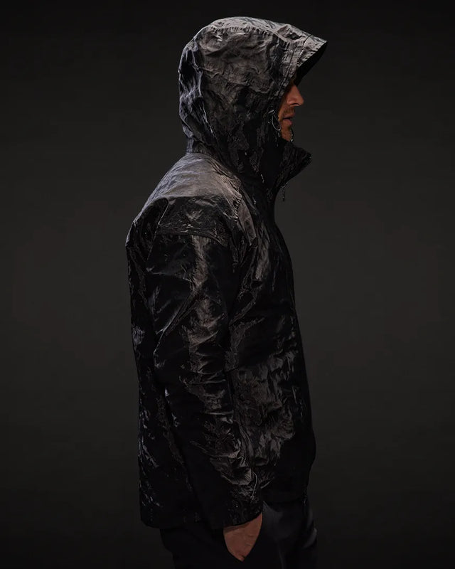 Once the metal face fabric and advanced membrane have been bonded together, a smooth backing is added on the inside of the jacket to make it soft. The high front collar comes with a fleece-lined chinguard, and the side pockets are fleece-lined too. The hood and hem both come with elasticated drawcord adjusters. The cuffs fasten tight with metal snap fasteners. And every panel is stitched then bonded for waterproofness.