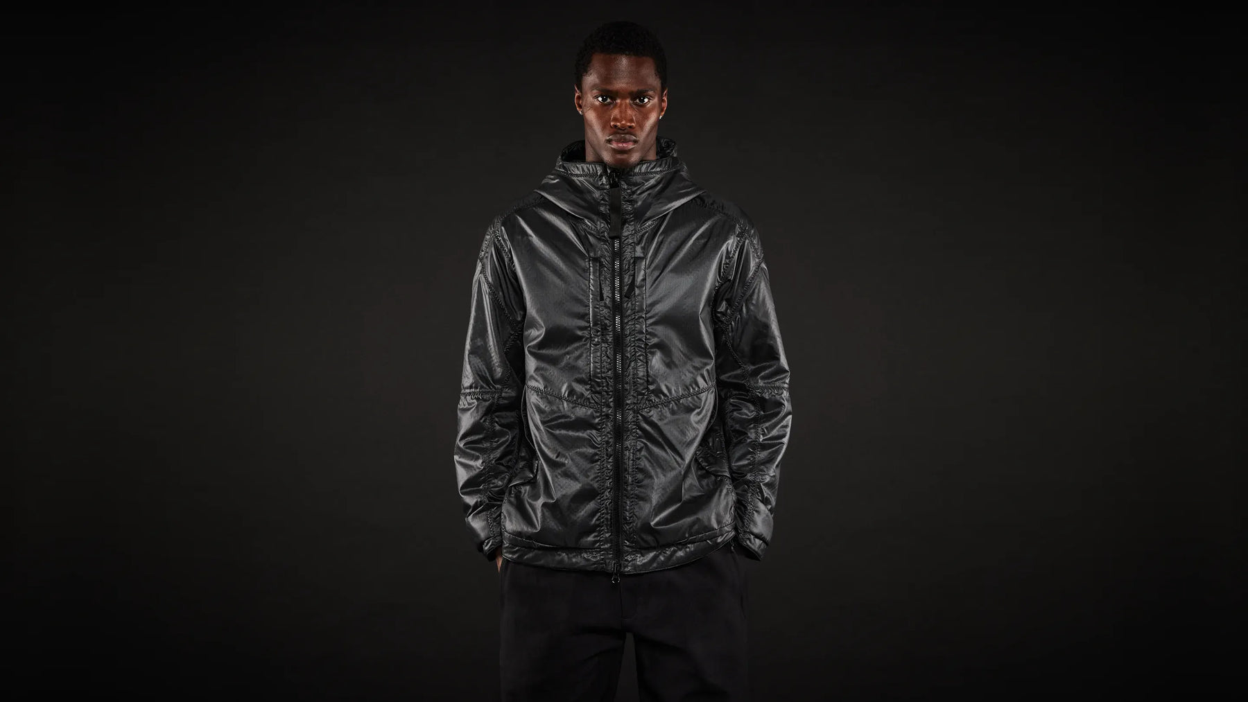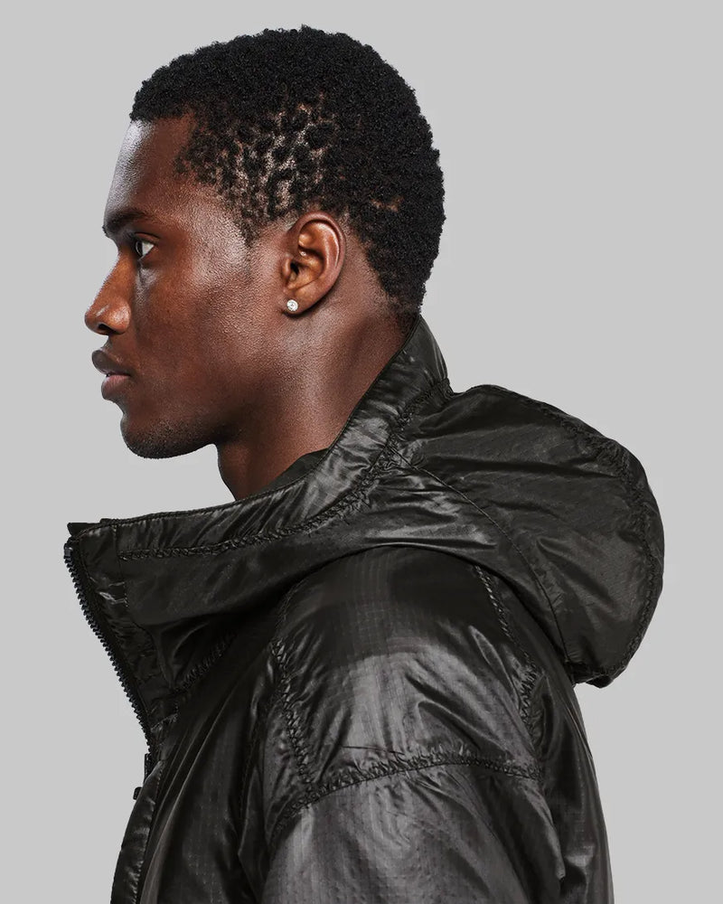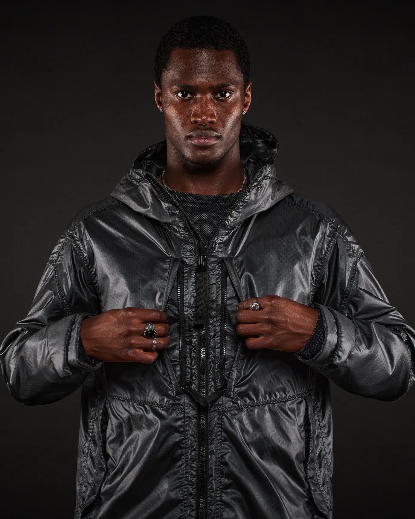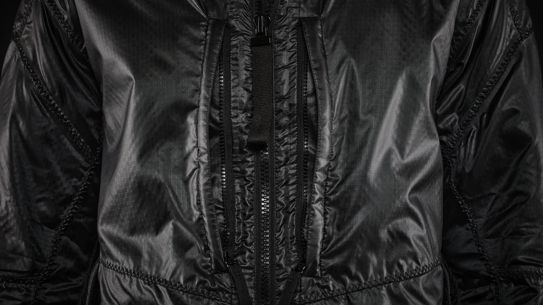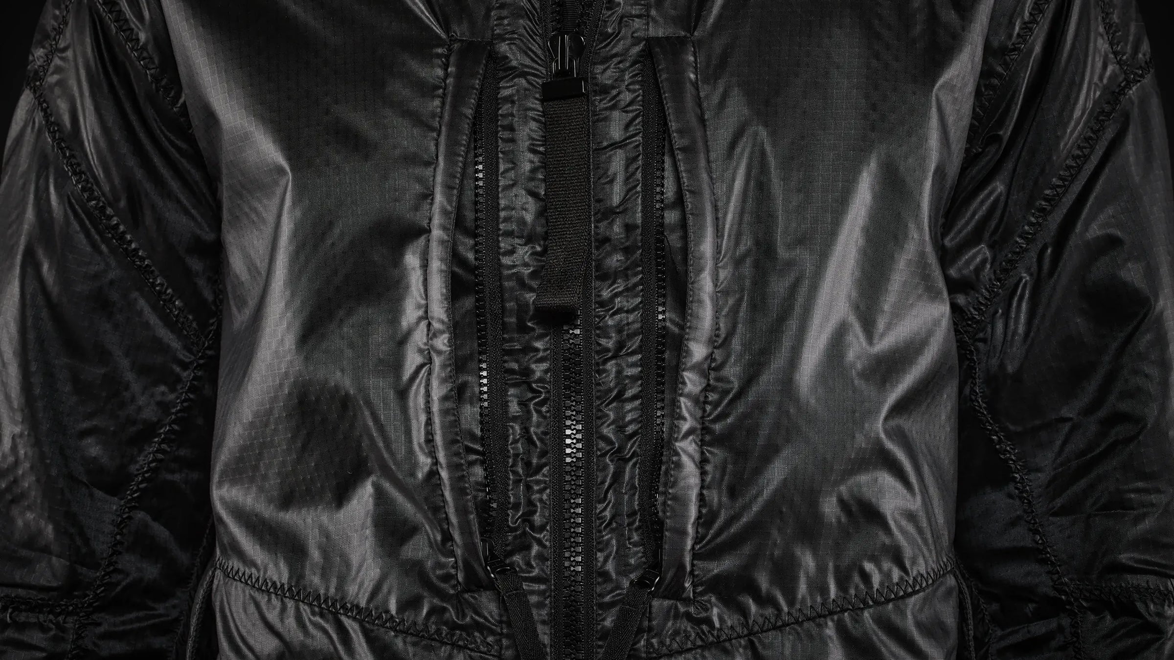 Protecting the aerogel is an outer shell built with the only fabric that’s currently on Earth, Mars and Titan – an extreme strength parachute used to land the first probe on Titan and the last Rover on Mars. The jacket’s soft metallic look, black contrast seam taping and zigzag stitching are based on the aluminised nylon and angled zippers of the early Project Mercury spacesuits. And the outer shell is designed with a transparent finish to create a window into the laser-drilled aerogel technology underneath.