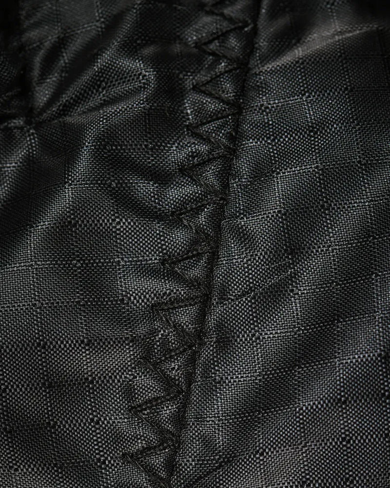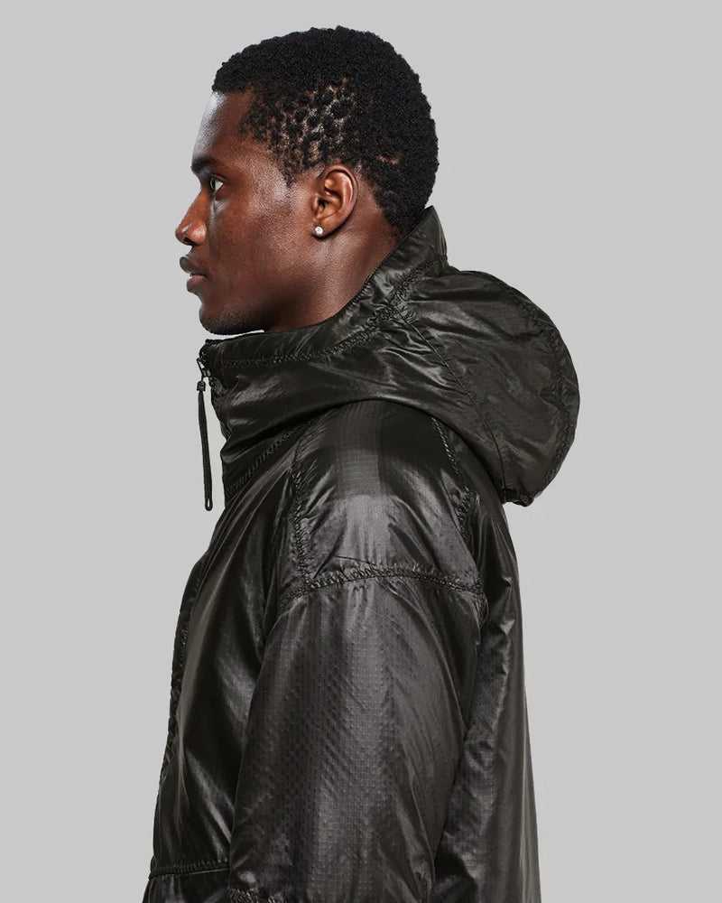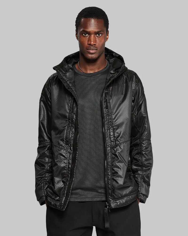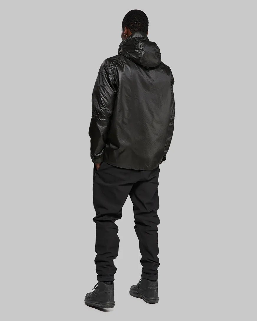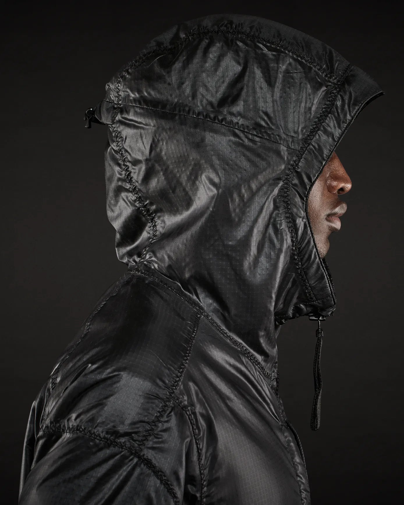 Protecting the aerogel is an outer shell built with the only fabric that’s currently on Earth, Mars and Titan – an extreme strength parachute used to land the first probe on Titan and the last Rover on Mars. The jacket’s soft metallic look, black contrast seam taping and zigzag stitching are based on the aluminised nylon and angled zippers of the early Project Mercury spacesuits. And the outer shell is designed with a transparent finish to create a window into the laser-drilled aerogel technology underneath.