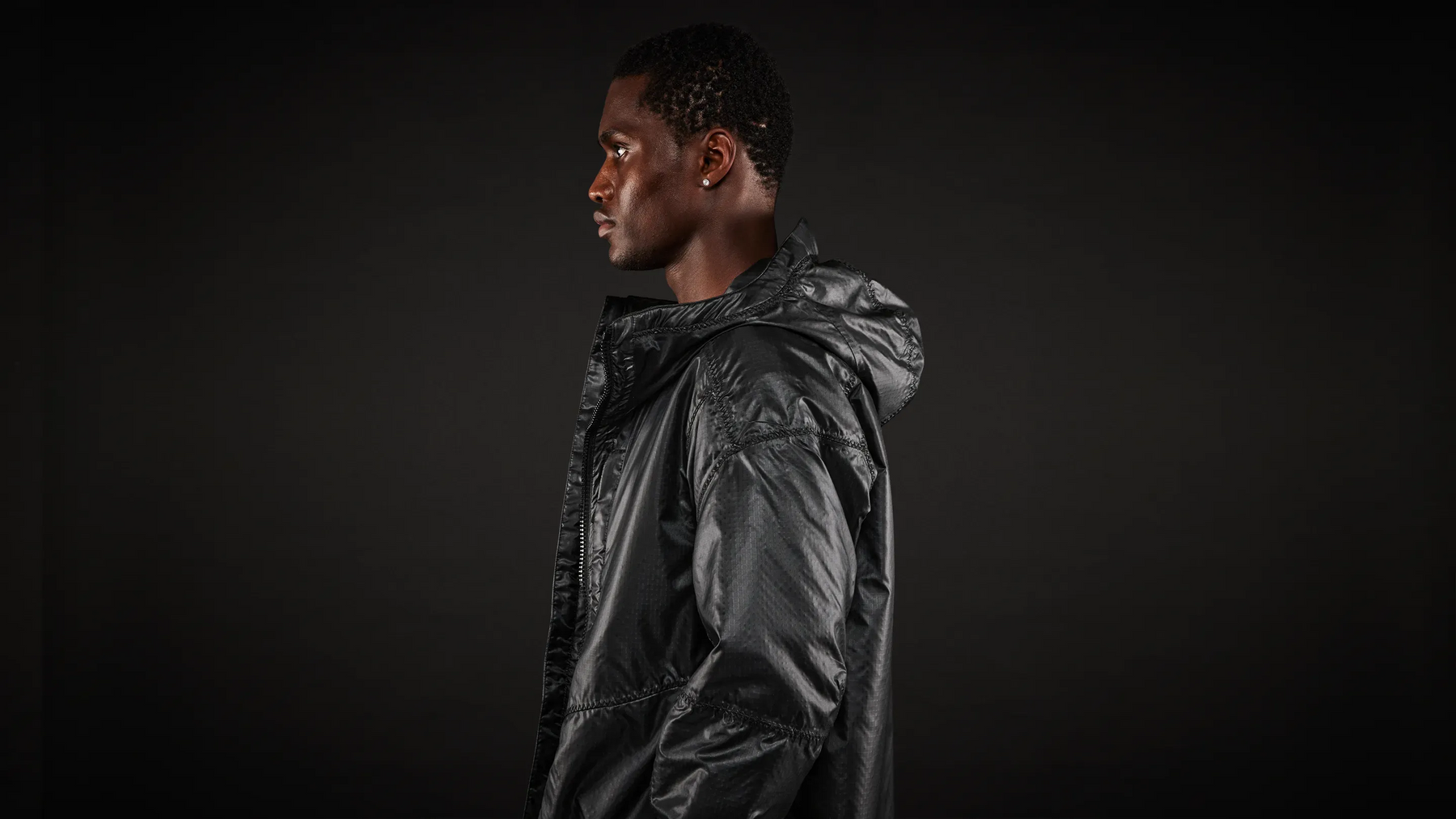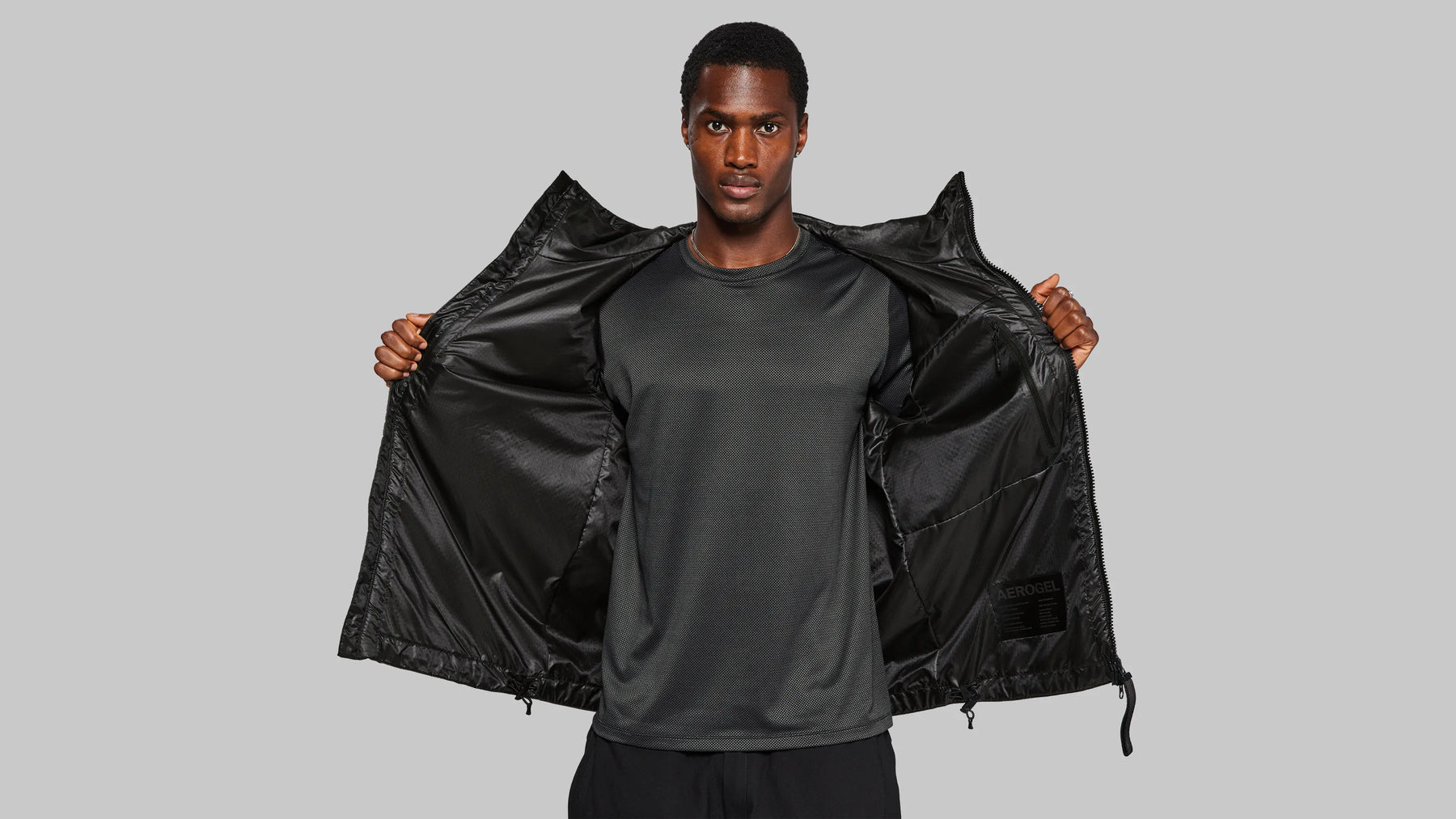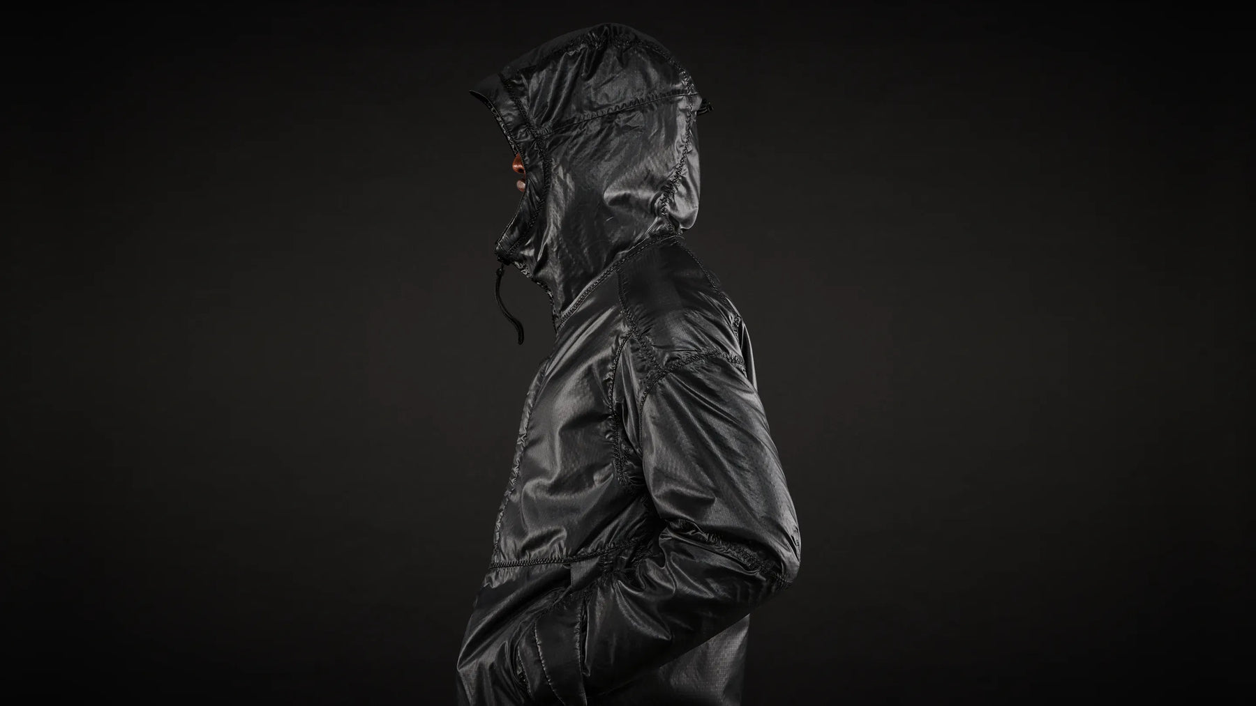 This entire jacket is built from two materials that count ‘travelling through space’ as their day job. On the inside is a completely new type of aerogel built by the same team making the new aerogel heat shield for the next Mars Rover. Laser-drilled with hundreds of micropores it’s the first aerogel in the world that’s flexible, durable, and waterproof.