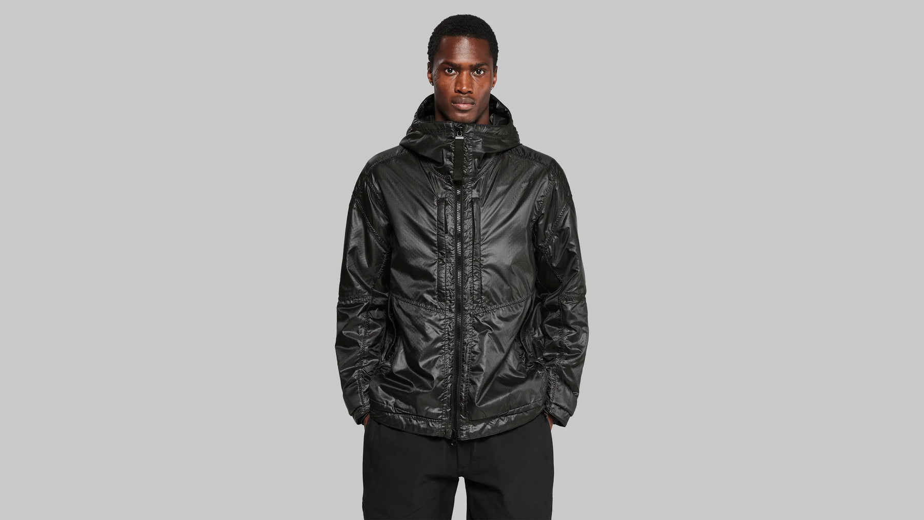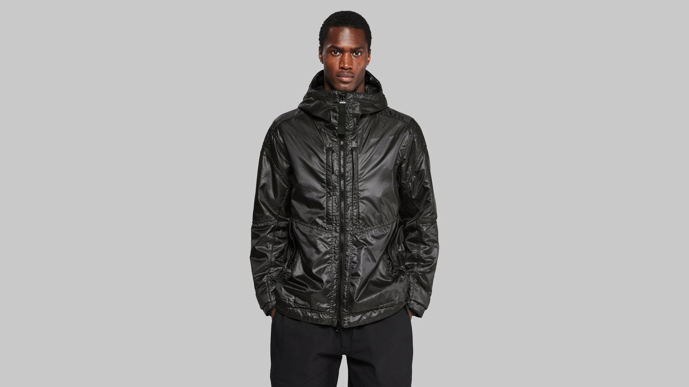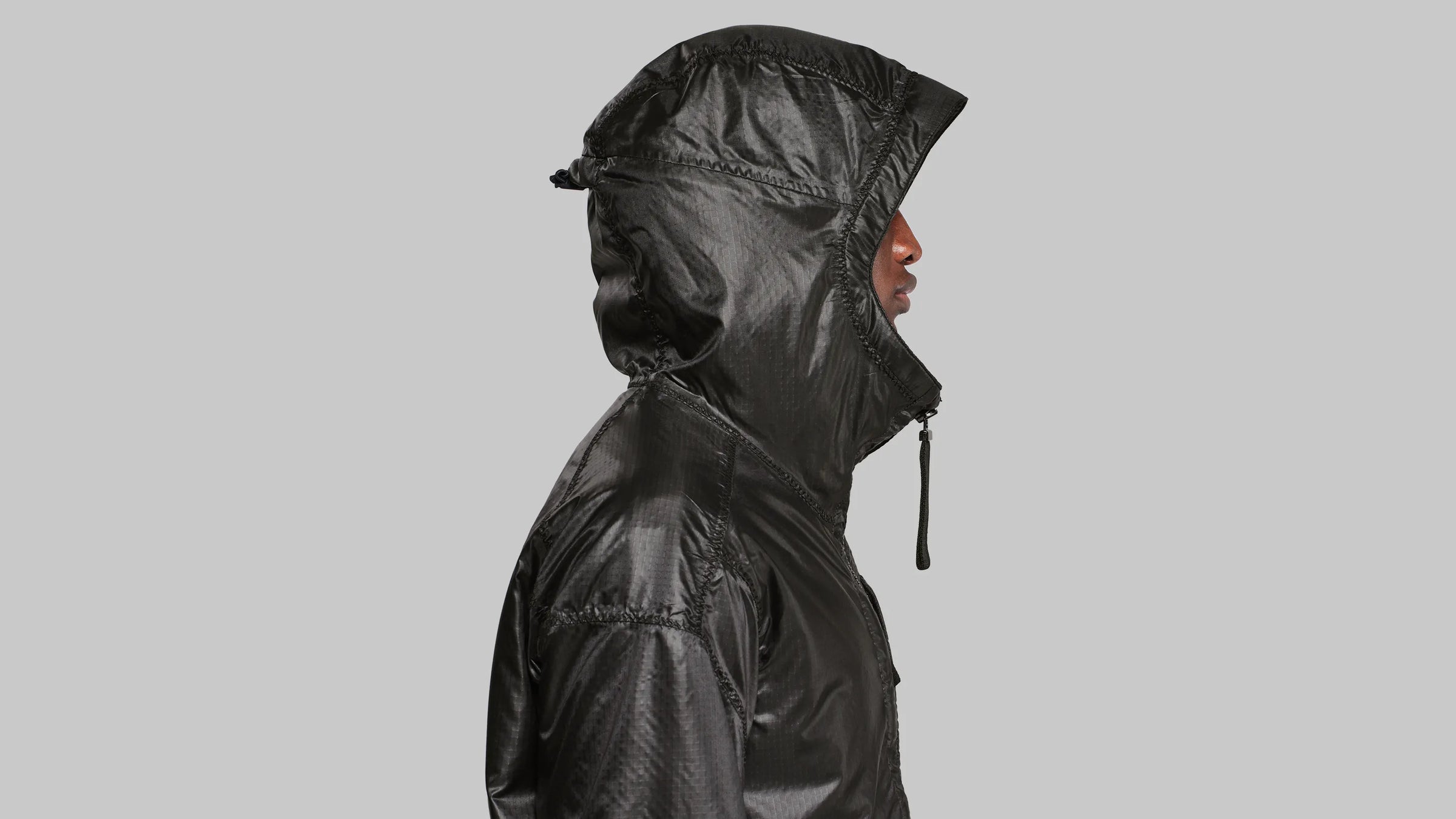 This entire jacket is built from two materials that count ‘travelling through space’ as their day job. On the inside is a completely new type of aerogel built by the same team making the new aerogel heat shield for the next Mars Rover. Laser-drilled with hundreds of micropores it’s the first aerogel in the world that’s flexible, durable, and waterproof.
