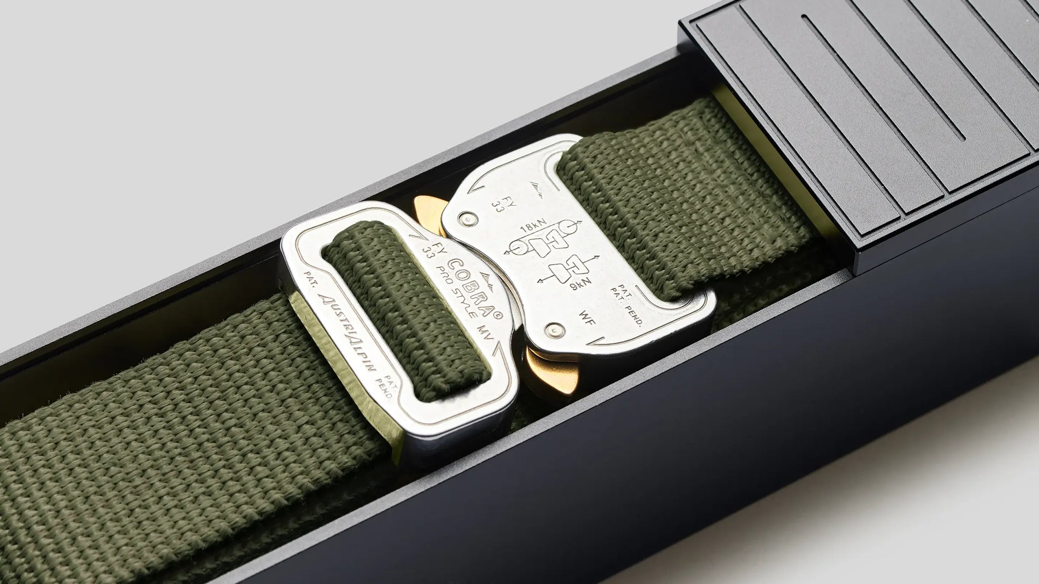 We’ve paired the VECTRAN™ fibre strap with a COBRA® buckle – the strongest and safest buckle on the planet. Engineered with a patented locking mechanism, it’s impossible to release under tension and can withstand 1.8 tonnes of force before breaking. It’s the same buckle Felix Baumgartner wore when he jumped from the edge of space. Each belt is assembled with 12 rows of ultra strong heat-resistant thread, an engraved metal tip by Riri, and comes in a custom anodised metal case with a 3D printed latch.